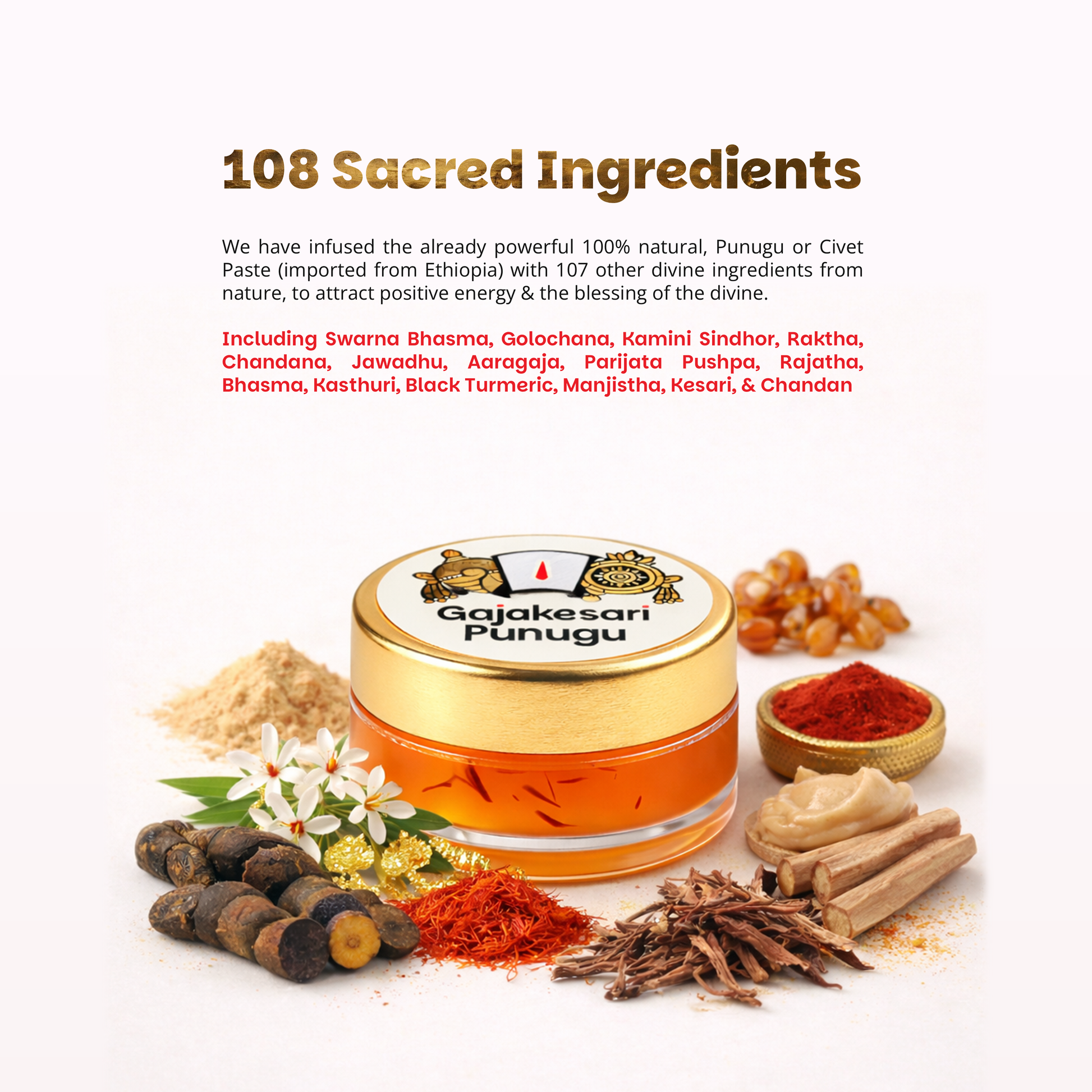 Gajakesari Punugu is a sacred traditional fragrance known for its deep, divine aroma. It has been used for centuries in spiritual practices and temple rituals as a symbol of purity, devotion, and reverence.